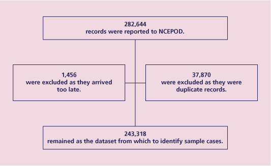 Prior to 1 April 2002, NCEPOD collected data on deaths occurring within 30 days of a surgical procedure performed by a surgeon or gynaecologist. These data acted as a sample pool from which to select study cases. However, since 1 April 2002, the remit of NCEPOD has been extended to include medical as well as surgical deaths, regardless of whether