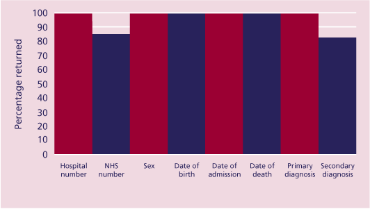 are displayed in Figure 23. Dates of birth and dates of death were obtained for all patients, as these were required fields. The hospital casenote number was absent in less than 1% (105/243,318) of records compared with the NHS number that was absent in 15% (36,573/243,318), although these include the majority of cases from the independent sector who do not use an NHS number routinely. Of the diagnosis fields, primary diagnosis was absent in less than 1% (199/243,318) of the cases compared with first subsidiary (secondary) diagnosis, which was absent 18% (43,377/243,318) of the time. The sex of