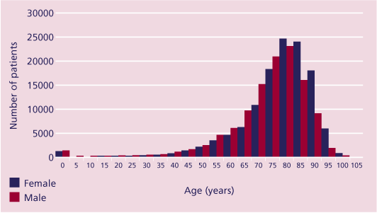 As the new remit included all deaths it was anticipated that a slight reduction in the mean age of patients would have been seen this year. However, despite the dataset being more than ten times larger, with a median (range) age of 80 (<1 to 109) years, the age distribution are comparable with those reported in previous NCEPOD reports (Figure 24).
