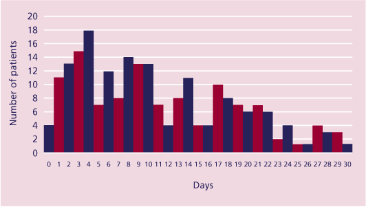 In comparison with 'progress of medical condition', the second most common complication following ERCP was sepsis (Table 47). Sepsis may be related to the high incidence of biliary stasis and infection in these patients, coupled with their age, underlying comorbidities and poor physical status. However, it does underline the need for an appropriate antibiotic strategy. There were two complications, perforation 2% (4/216) and haemorrhage 4% (9/216), that were directly attributable to the ERCP, and both of these are the most likely reason for the subsequent surgery in six patients.