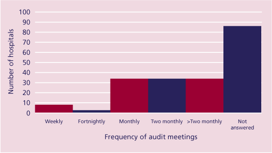 multidisciplinary team meetings. Five hospitals did not answer this question but of those that did, 58% (110/189) held audit meetings and 17% (19/110) of these were for doctors alone. The frequency of meetings varied from weekly to greater than bi-monthly, with 68% (75/110) having meetings bi-monthly or more regularly (Figure 7).