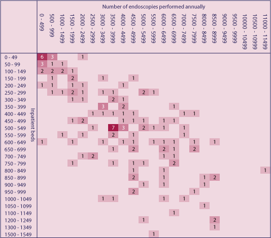 WORKLOAD OF ENDOSCOPY UNITS The number of weekly endoscopy sessions is correlated with the annual number of patients undergoing an endoscopy within an endoscopy unit (Figure 4). However, it should be noted that the data represented includes only 42% (81/194) of the hospitals that submitted a questionnaire on endoscopy facilities. Missing data has prevented us showing a complete picture. Assuming that the information was not returned because it was unknown to the hospital then one has to question how departments can operate without knowing this basic information. The BSG Report1 recommends that an average DGH performing 2,500-3,000 endoscopies per annum should allow 12-14 sessions per week which is broadly consistent with data reported in Figure 4. There is also a reasonable correlation between the number of endoscopies performed and the number of inpatient beds within the hospital (Figure 5). The data in this graph represents 74% (144/194) of the hospitals that submitted a questionnaire on endoscopy facilities.