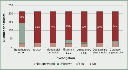 All patients would have had a clinical examination and a 12 lead ECG. Anaesthetists were asked to indicate whether elective patients had received more sophisticated cardiac investigations. Emergency admission patients were excluded because it would have been unlikely that there would have been time to organise these sorts of investigations. For this analysis the figures do include patients who went on to have endovascular repair. Patients may have had more than one preoperative investigation. The results for large and for intermediate sized vascular units are shown in Figures 1 and 2. Only three cardiac investigations were reported from remote units, all being transthoracic echocardiography. In 14% (67/477) of questionnaires no data was available as to whether any investigations had been performed or not. Transthoracic echocardiography was the most common investigation being used in 60% (244/410) of cases overall. The NCEPOD advisors suggested that it is relatively easy to obtain a transthoracic echocardiography investigation for a vascular patient compared to the other investigations listed. The advisors were of the opinion that the test was helpful as an estimate of ventricular function and as a means of excluding unsuspected valvular disease, although there is little published evidence that the use of echocardiography affects outcome. It was thought that echocardiography was indicated in most aneurysm patients when it was not possible to judge ventricular function by simple clinical tests (e.g. the ability to climb two flights of stairs). Other investigations were utilised to a small extent in the large units, but hardly at all in intermediate units. This may indicate greater difficulty in accessing sophisticated investigations at intermediate sized units. NCEPOD did not have enough information to calculate the cardiac risk for each individual patient so it was not possible to make an overall judgement as to whether the investigations were appropriate or not. The anaesthetist was asked, if an investigation had been performed, whether or not they judged that the results of the investigations had affected the management of the patient. Table 5 details the numbers of tests, for all sizes of unit, which were regarded as affecting management.