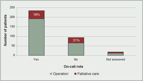18% (42/231) of patients received palliative care in units where there was an on-call rota for vascular surgery and 31% (29/93) received palliative care in units where there was not an on-call rota (no information about on-call rotas was given for 18 patients). NCEPOD does not know whether these data were affected by hospitals that did not have an on-call rota transferring patients to hospitals that did.