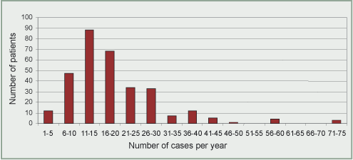 This section must be interpreted with great caution because the denominator data are based on returned surgical questionnaires. Some surgeons may have returned more than one. This is most likely to happen with surgeons who perform many aneurysm repairs but could happen with low volume surgeons by chance. The most senior operating surgeon was asked to supply the number of AAA repairs performed in 2002/03 and the source of that information. In 122 questionnaires the surgeon chose not to answer the question, 67 answers were “from memory” and 245 from a logbook or information system. NCEPOD believe that clinicians and Trusts should take joint responsibility for collecting high quality data about procedures performed and outcomes. This is recognised as part of good clinical governance. Back to topNumber of casesFigure 8 shows how many patients were operated on by a surgeon performing between one and five elective AAA repairs in 2002/03, the number who reported performing between six and 10 and so on. In all cases the surgeon reporting data had performed at least one elective repair in 2002/03. It must be remembered that some surgeons may have returned more than one questionnaire and many surgeons relied on memory. Since surgeons performing the most AAA repairs are more likely to have contributed more than one case, the right hand side of the chart (which already demonstrates that relatively few surgeons performed more than thirty AAA repairs) may be an overestimate. Only 82% (255/312) of procedures were performed by surgeons who had probably performed more than 10 elective aneurysm repairs in the year 2002/03. Back to topWorkload and outcomeNCEPOD has considered whether the data available can be of use in examining the relationship between the outcome of surgery and the number of procedures that a surgeon performed in a year. While other studies have suggested a relationship between outcomes after AAA repair and the experience of the surgeon, the relationship is not clear in this study. This may reflect small numbers or the fact that the experience of the surgeon is, as seems likely, only a part of the explanation of postoperative mortality. What we do note in the present study however, is that patients operated on by surgeons performing over 30 AAA repairs a year had fewer postoperative deaths than average. If this is true, it raises questions about subspecialisation and volumes of work necessary for a hospital to offer a vascular service. Could it be that surgeons performing aneurysm repair should be aiming to do one a week? Should aneurysm repair be concentrated in fewer units? Back to top |