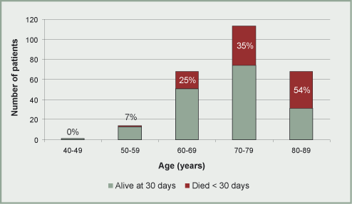 Figure 9. Age by mortality n=264. Percentages refer to patients who died in hospital within 30 days.