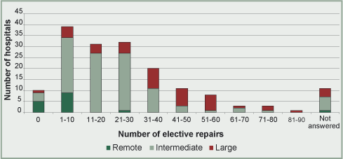 As expected, larger units had a bigger workload. However the numbers of operations performed at some hospitals appears remarkably small. Six large units reported performing 10 or fewer elective AAA repairs in 2002/03, and 29 intermediate hospitals reported performing 10 or fewer (fewer than one a month). All but one of 15 remote units reported performing 10 or fewer procedures. In total 31% (49/158) of hospitals performed 10 or fewer elective open AAA repairs in the 12 month period. It must be remembered that this is the total for the whole institution. Individual surgeons and anaesthetists will have done fewer cases in the year than this.