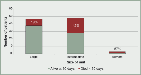 There was a difference in outcome associated with undergoing surgery at a large vascular unit compared with an intermediate vascular unit (Figure 15). This is an unexpected finding. The numbers were small. Further investigations of the management of unruptured AAAs admitted as emergencies would be helpful to determine if this phenomenon is sustained in other studies, Transfer policies may also have an influence on figures for the survival of emergency AAA patients. Back to top |